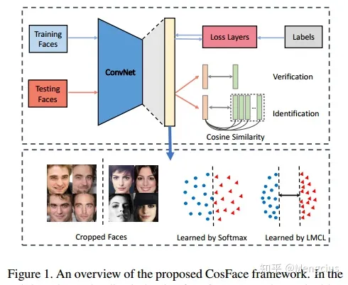 CosFace是腾讯AI Lab的Hao Wang等在CVPR2018.01发表,在SphereFace基础上改进了对特征向量归一化和additive cosine margin。由此,通过归一化和余弦决策边界的最大化,可实现类间差异的最大化和类内差异的最小化。CosFace: Large Margin Cosine Loss for Deep Face Recognition