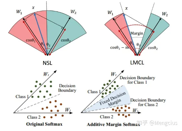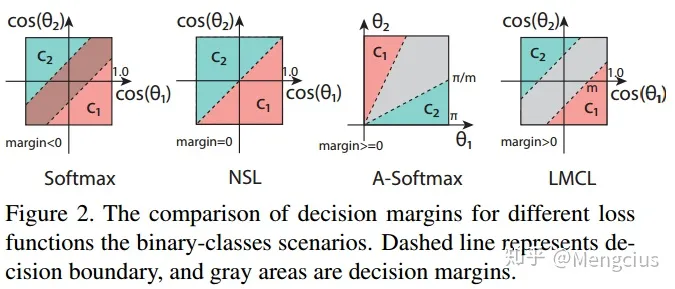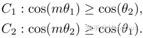 - 决策边界:它的边界既依赖于权重向量的大小,又依赖于角度的余弦值,从而导致余弦空间中的决策区域重叠(重叠就是margin < 0)。