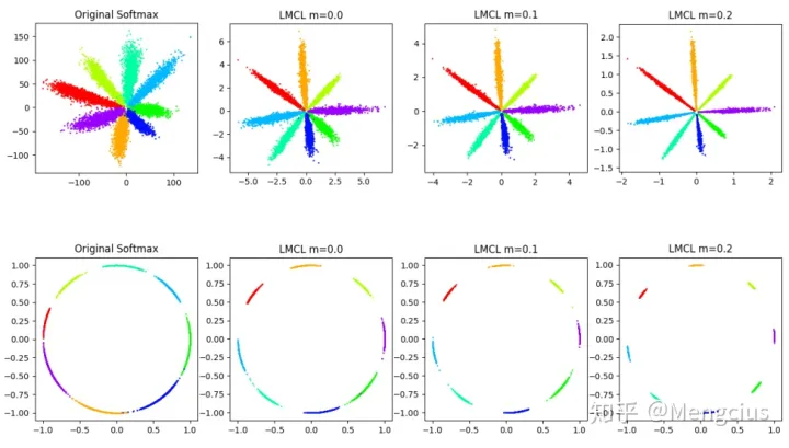 - 在具有2D特征的8个身份上进行了不同损失函数的实验。第一行将2D特性映射到欧几里得(Euclidean)空间,而第二行将2D特性映射到角度(angular)空间。随着margin项m的增加,差距变得更明显了。