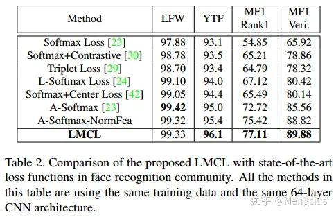 - 损失函数的比较,这里都用了相同的数据集CASIA WebFace,和相同的64层CNN架构。LFW效果不如SphereFace,但也差不多。