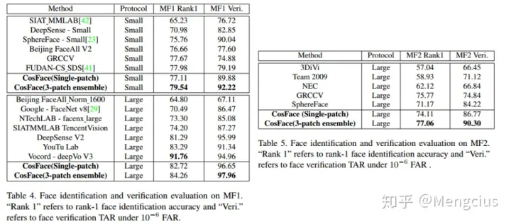 - 人脸识别和验证比较,在MF1 (MegaFace Challenge 1)、MF2 (MegaFace Challenge 2)上