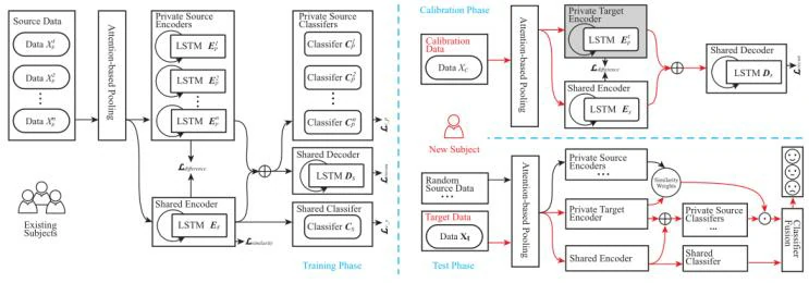 PPDA的框架如图1所示。整个结构可分为训练阶段、校准阶段和测试阶段。在训练阶段,首先采用基于注意的池化方法,利用脑电信号关键通道和波段的空间信息。然后,采用基于长短期记忆的编解码器方案研究时间依赖性。用共享编码器Es和私有编码器E1 ~ np来分别捕获被试不变的情感表征和私有成分。通过使用编码器的输出,我们进一步建立了一个共享分类器Cs和单个分类器C1 ~ np来同时识别情绪。在这一阶段,只使用标记的源数据来训练模型。在校准阶段,我们使用一个收集的最开始的数据,在训练过的Es和解码器Ds的帮助下,对新被试的私有组件进行建模。在测试阶段,不仅可以像域泛化方法那样使用共享分类器的管道,还可以通过与私有源组件的相似性从私有分类器中获取知识。最后,应用分类器融合策略对两种识别结果进行融合。