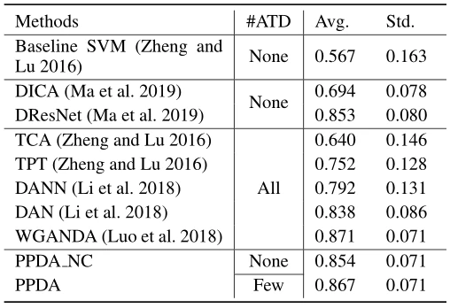 PPDA得到了稳定、良好的结果,准确率约为86.7%,标准差约为0.071。如表1所示。对于在模型训练过程中不依赖任何目标数据的DG方法,如DICA和DResNet,作者的模型的准确率分别提高了22.71%和1.41%,这表明即使使用少量的目标数据也会提高模型的识别性能。与DA方法相比,作者的模型优于所有的DA方法,除了WGANDA略有下降。虽然该方法的识别性能不是最优的,但在保持识别精度的同时,大大缩短了校准时间,具有重要的现实意义。省略了PPDA的校准环节的模型记为PPDA_NC,其他部分不变,重新运行SEED实验,检验其泛化能力。识别性能的降低说明了校准阶段的重要性。