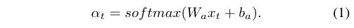假设xt∈Rm作为t时刻的一个EEG特征向量的注释,其中m为特征维数。xt的每一维数代表来自某波段特定信道的信息。我们得到加权脑电图特征向量xt,其中xt=AT (xt), AT表示基于注意的池化。将xt输入到单层全连通神经网络中,通过softmax函数测量表示xt各维重要性的归一化权向量αt∈Rm,为: