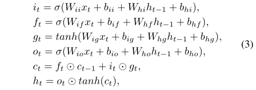 其中it, ft, gt, ot是输入,遗忘,单元格和输出门。ht和ct分别为t时刻的隐藏状态和单元状态,ht−1为t−1时刻的层隐藏状态或最开始的初始隐藏状态。σ代表sigmoid函数。