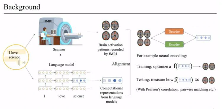 孙博士的团队使用先进的功能性磁共振成像(fMRI)技术,捕捉大脑在语言刺激下的活动模式,并将这些模式与从复杂的语言模型中提取的计算表征进行精确对齐。他介绍了一种创新的神经编码框架,这种框架能够在训练阶段优化大脑活动与语言模型之间的映射函数,并在测试阶段通过皮尔逊相关系数等统计方法,验证模型预测的准确性。