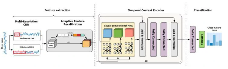 作者提出了一种新的AttnSleep架构,用于自动睡眠阶段分类。首先提出了一种新的基于多分辨率CNN(MRCNN)和自适应特征重新校准(AFR)的特征提取模块。MRCNN从不同频带中提取低、高频对应的特征,AFR对特征的相互依赖性进行建模,以增强特征学习。其次提出了一种新的时间上下文编码器(TCE),它部署了一个具有因果卷积的多头注意,以有效地捕获所提取的特征中的时间依赖性。作者还设计了一个类感知的损失函数,以有效地解决数据不平衡的问题,而不需要额外的计算。