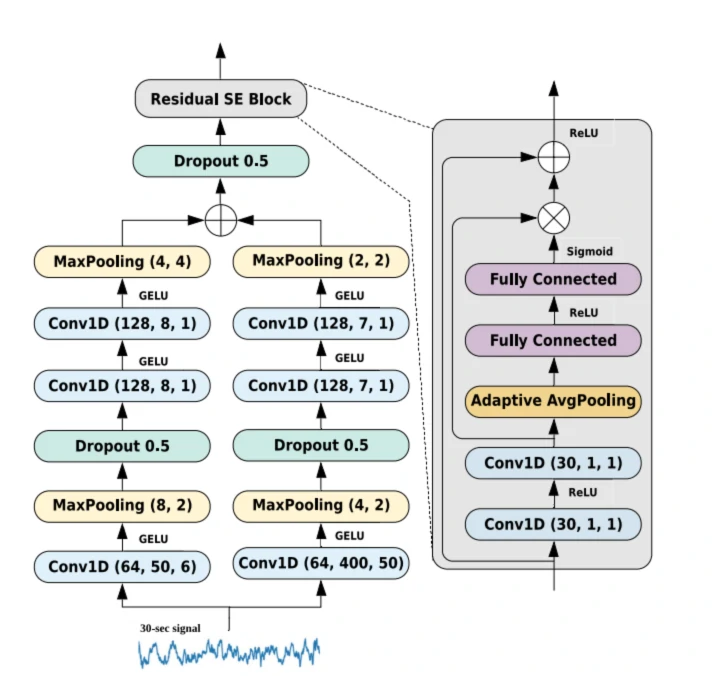 作者提出的模型由三个主要的块组成,即1.特征提取、2.时间上下文编码器和3.分类。首先,利用具有双分支CNN体系结构的MRCNN,从一个30秒的脑电图信号中提取特征。特别是,它通过小核卷积提取高频特征,通过宽核卷积提取低频特征。在MRCNN之后,提出了一个AFR模块来建模由MRCNN提取的特征之间的相互依赖关系。