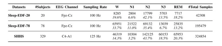 在实验中,使用了三个公共数据集,即sleep-edf-20、sleep-edf-78和睡眠心脏健康研究(SHHS),如表一所示。对于每个数据集,我们在不同的实验中使用了单一的脑电图通道。