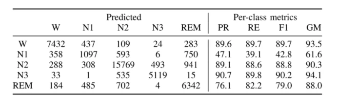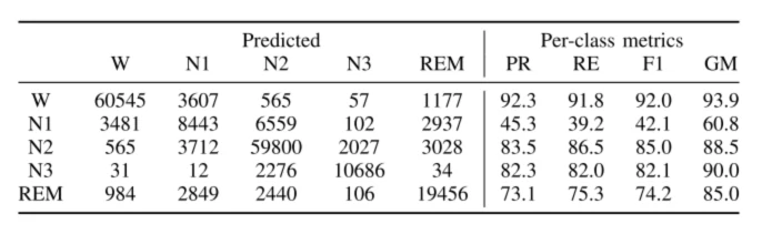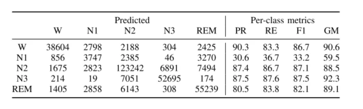 表二、表三和表四显示了所提模型在Fpz-Cz信道上的应用的混淆矩阵,sleep-edf数据集和SHHS数据集中的C4-A1通道。混淆矩阵的计算方法是将测试数据的所有评分值相加。每一行表示专家分类的样本数量,而每一列表示我们的模型预测的时代数。表格中还显示了每个类的精度、查全率、F1分数和GM平均值。