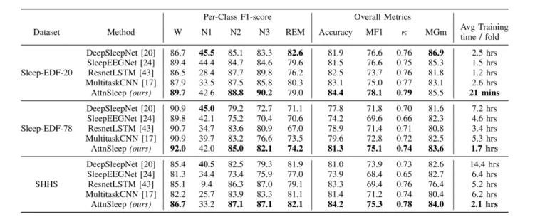 该论文作者提出了一种新的睡眠阶段分类结构,称为AttnSleep。AttnSleep依赖于利用多分辨率卷积神经网络(MRCNN)和自适应特征重新校准(AFR)两个模块来提取脑特征。这两个模块之后是时间上下文编码器(TCE)模块,该模块通过使用多头注意(MHA)机制来捕获所提取的特征之间的时间依赖性。在三个公共数据集上的实验结果表明了该模型在各种评估矩阵下优于最先进的方法。