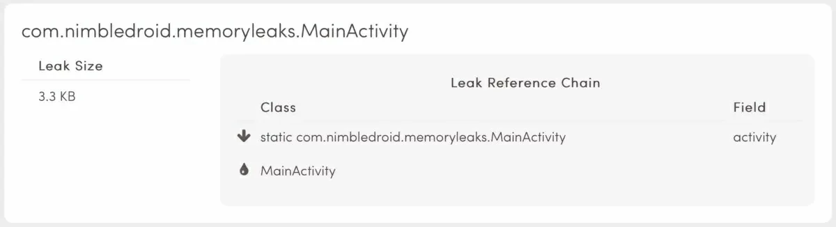 在类中定义了静态Activity变量,把当前运行的Activity实例赋值于这个静态变量。这个静态变量在Activity生命周期结束后没有被清空就导致了内存泄漏,因为static变量是贯穿这个应用的生命周期的,所以被泄漏的Activity就会一直存在于应用的进程中,不会被垃圾回收器回收。
