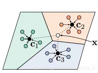 在该论文所提出的原型网络方法中,需要将样本投影到一个度量空间,且在这个空间中同类样本距离较近,异类样本的距离较远。下图为这个投影空间的示意图,假如在这个投影空间中,存在三个类别的样本,且相同类别的样本间距离较近。为了给一个未标注样本x进行标注,则将样本x投影至这个空间并计算x与各个类别的原型距离,离得近的就认为x属于哪个类别。