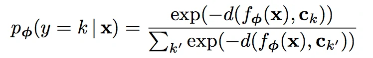 得到每个类的原型后,就需要根据样本与各个类的原型的距离,求一个样本属于一个类的概率。因为在训练时这个样本是已标记的,即我们已知类k的原型,已知一个属于类k的样本,求此样本属于类k的概率,因此我们的目标函数就是求这个概率的最大值。
