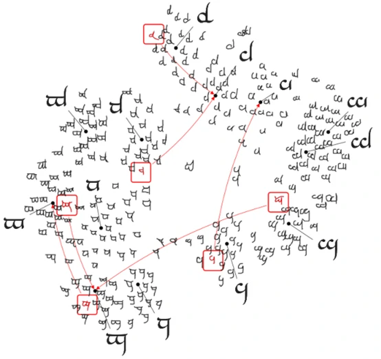 该论文使用原形网络在Omniglot数据集上进行实验,使用欧几里得距离作为距离度量,分别在1-shot和5-shot进行实验。下图为某个子集的度量空间的可视化,其中黑色点代表每种类别的原形,红色代表被错误分类的数据,红色箭头的指向为真实的类别。