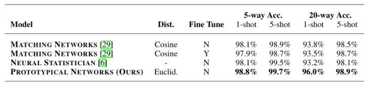 训练episode的设置为60个类别和每个类别有5个query查询点。实验结果发现在训练和测试时保持相同的样本数据量(即shot相同)和episode使用更多的类别(即way更大)会使得实验效果更好。下表展示的是该论文所提出的方法与其他方法在Omniglot数据集上的结果对比。