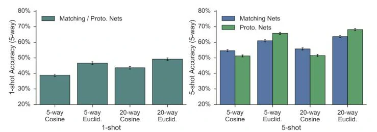 还有个比较有意思的实验结果:在N-way M-shot问题中的M=1,也就是one-shot的情况下,prototype network实际上等价于matching network;此外,无论是one-shot还是M-shot(M>1),欧氏距离(Euclid.)的效果都要比余弦距离(Cosine)的效果好(如下图所示),因此本文使用的距离计算公式为欧氏距离。