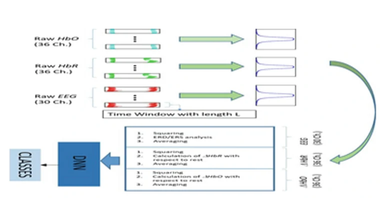 单模态的脑电图(EEG)和单模态的功能性近红外光谱(fNIRS)已广泛用于脑成像。然而,近年来,这两种模态的融合在神经成像方面也显示出良好的结果,这是因为它们在时间和位置上准确识别大脑活动的分辨率,同时,由于EEG的时间分辨率高,空间分辨率低,而fNIRS的空间分辨率高,时间分辨率低,因此这两种模态之间会形成一种互补的特性,从而能够获得更加丰富的大脑信息。然而,基于fNIRS和EEG的认知任务分类涉及到复杂的模式识别问题,传统的分类方法需要先验的特征选择和预处理的工作,但是这并不能保证得到最优的分类。深度神经网络(DNN)可以克服这一挑战,DNNs直接从fNIRS和EEG信号中提取特征,并且大量的特征预处理工作。此外,随着计算能力的提高,DNN已成为高精度分类的实用选择。