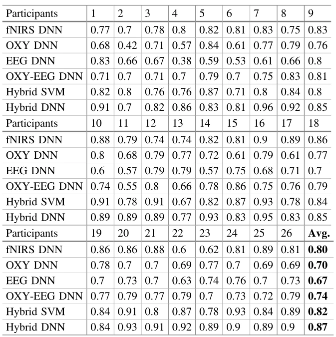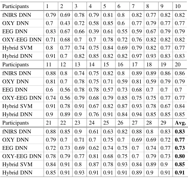 表3-6分别报告了n-back、DSR、WG和MI任务中所有记录组合(EEG、fNIRS (DHbO - DHbR)、fNIRS (DHbO)、EEG + fNIRS (DHbO - DHbR)和EEG + fNIRS (DHbO - DHbR))基于DNN分类和基于SVM分类的单被试准确率。计算了26名被试在脑力负荷任务和29名被试在MI任务中的平均准确率。