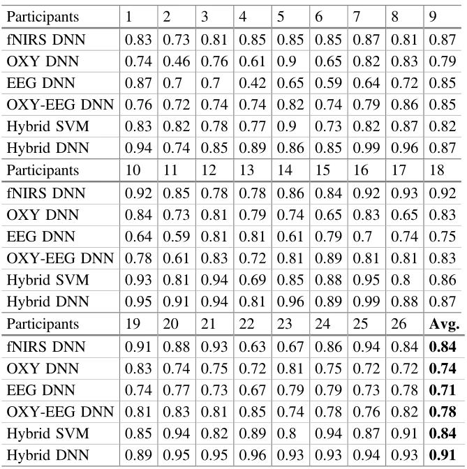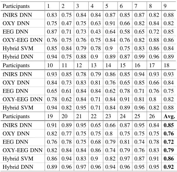 对于所有事件,与独立方法相比,全混合EEG-fNIRS具有最高的平均准确性。在所有的实验中,采用DNN作为分类器的效果都优于传统的SVM分类器。DSR任务的改进率最高,为8%。总体而言,2类实验(MI、DSR和WG)的平均分类准确率高于4类n-back测试,正如预期的那样,因为n-back测试中可能存在的类更多。所提出的DNN分类器对WG任务的准确率为92%,而SVM的准确率为86%。