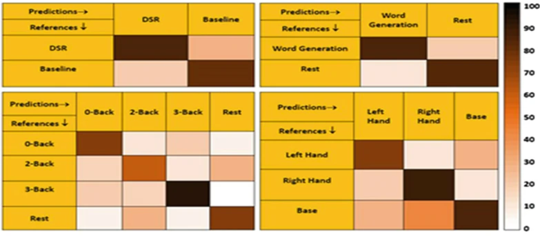所有实验的混淆矩阵如图3所示。这些矩阵的行代表预测条件标签,而列代表参考标签。在所有的实验中,在所有的个体类别中都取得了显著的成绩,并且在混淆矩阵(对角元素,深棕色)中获得了显著的和正确的识别。在n-back测试中,3-back类相对于其他类具有最高的真正分类,2-back类具有最低的真正分类。3-back和2-back的试验显示出最严重的错误分类,3-back被归类为2-back,反之亦然。错误分类的模式表明,当项目被错误分类时,他们更有可能与难度相近的项目相混淆。在MI测试中,右手动作的解码性能较好,左手动作的真阳性分类最小。在两类实验中进行分类比四类实验产生更高的整体准确率。在WG和DSR中,两类都有相似的真阳性分类率,而误分类在两类中几乎相同。