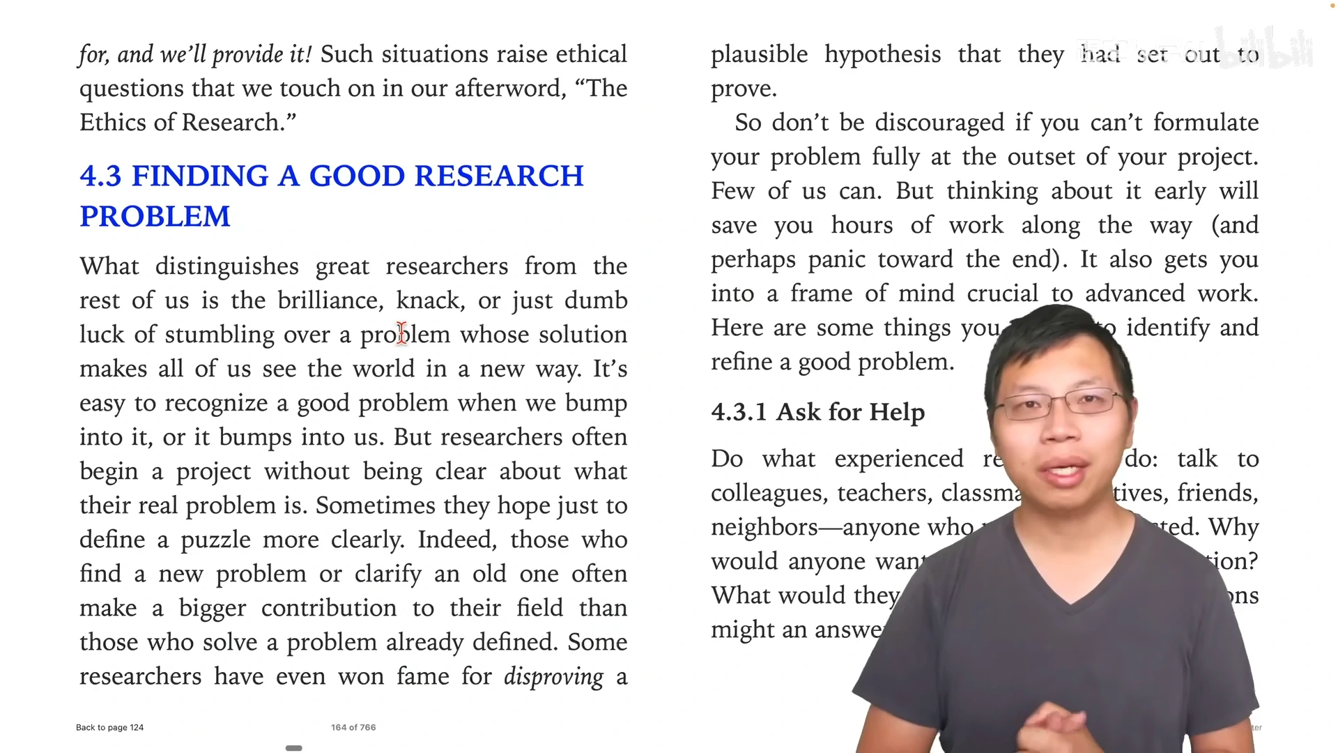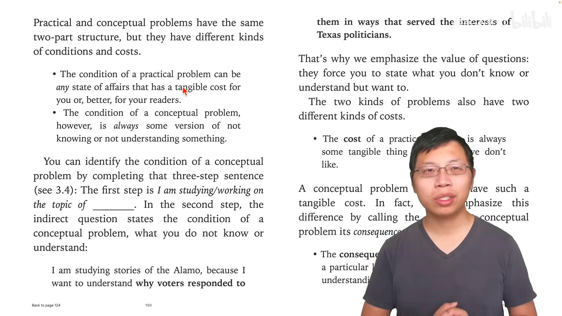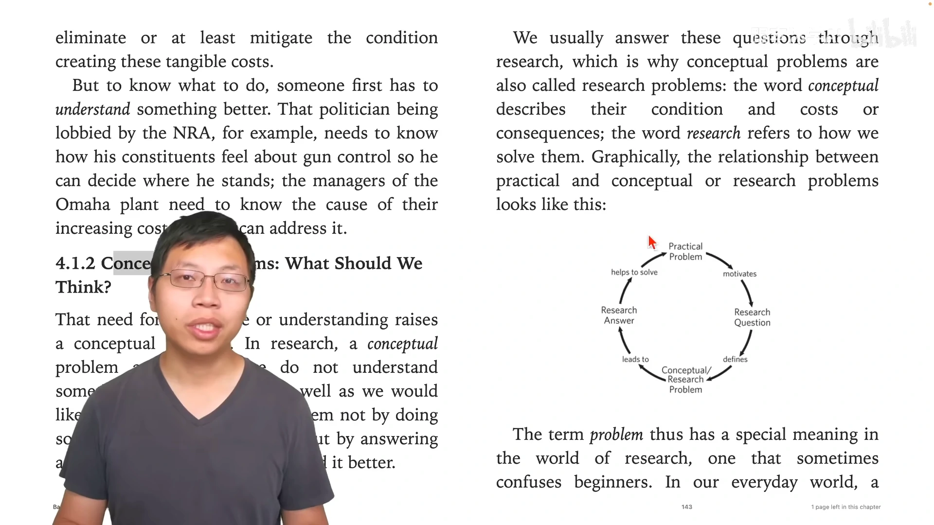 - 概念问题(conceptual problem):这些问题不是要去解决某一个实际的痛点,而是说如果我们回答他的话,会对某一个事情或者这个世界有一个更好的认识。在科学领域,绝大部分问题是这种概念上的一些问题,帮我们更好的理解某一个东西。