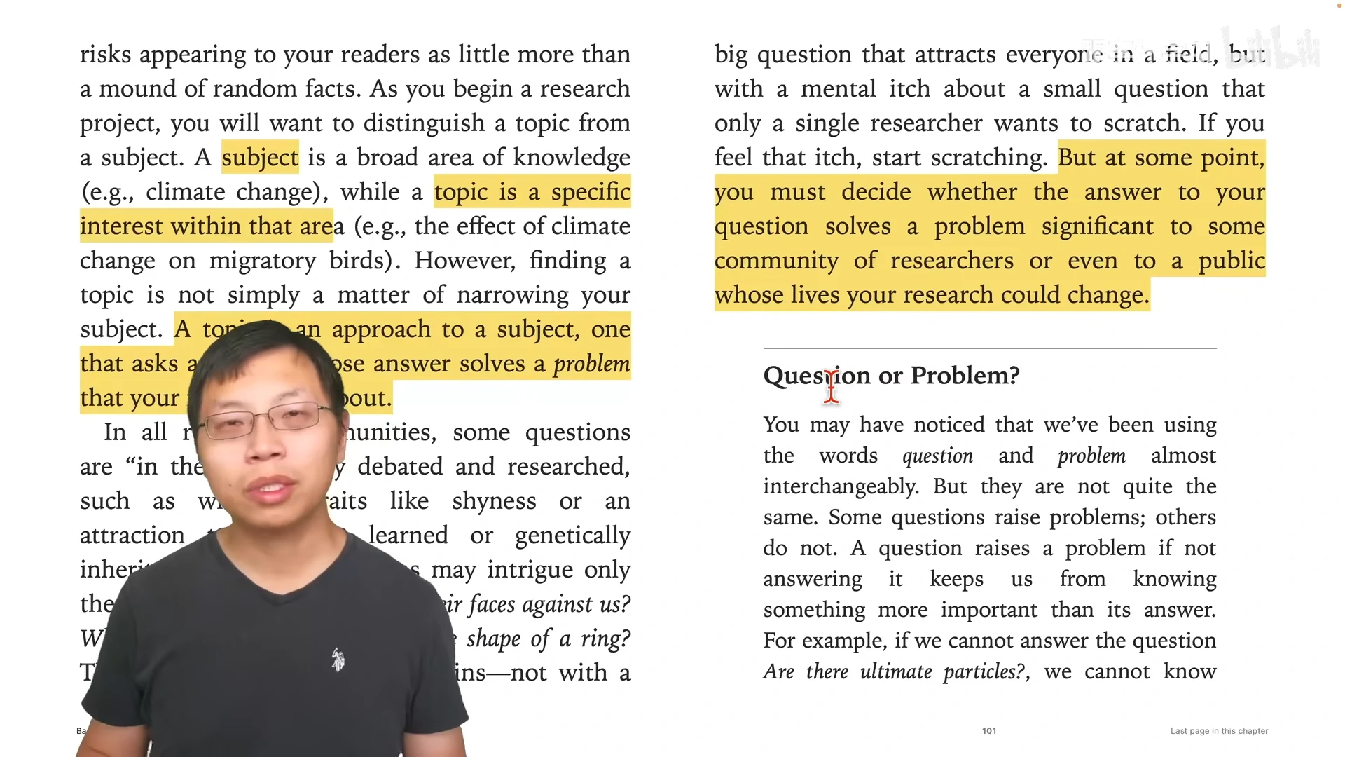 - 核心是说先找到大小合适的话题,然后问一些问题,然后把一个读者认为值得去了解答案的问题抽出来,做成一个研究问题,我们的研究问题可能是实际的,也可能是概念上的