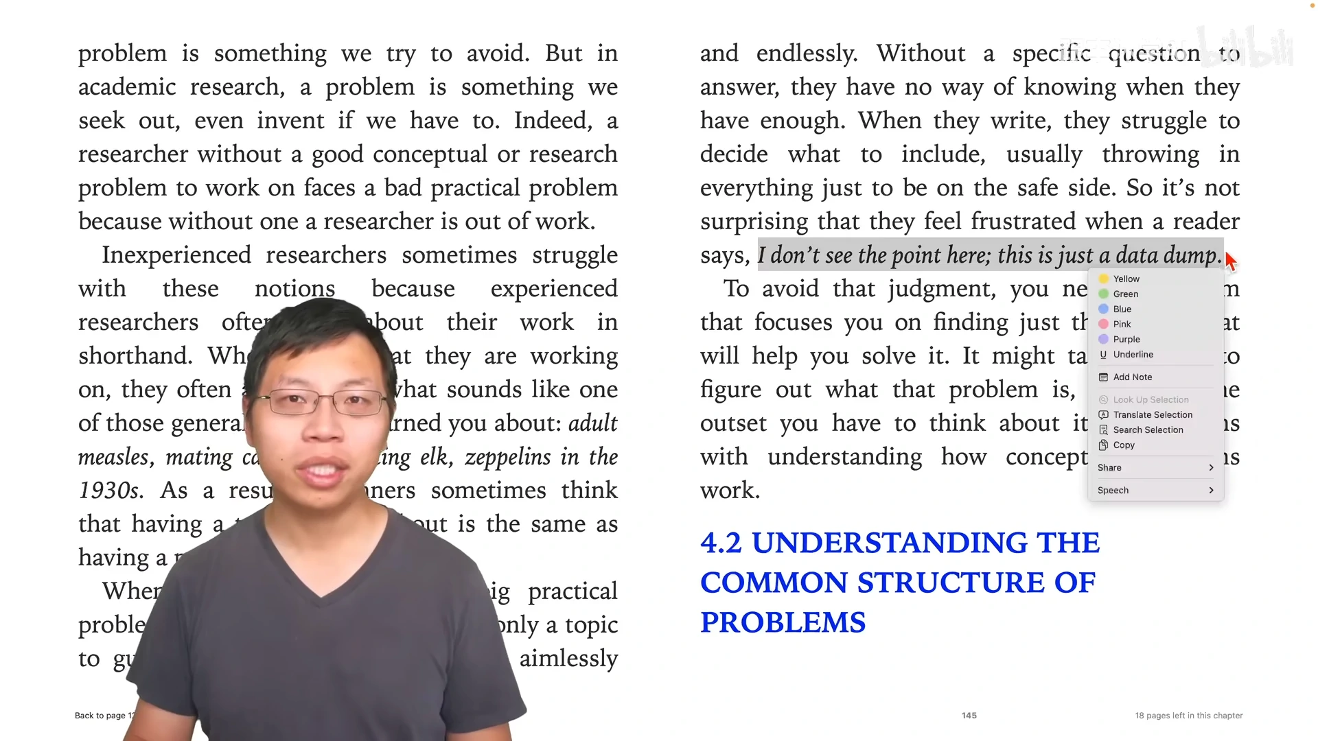 - 如果你没有问题的话,可能你整个论文写出来就是很多数据在里面,很多证据摆在里面,但是别人看上去就没有能找到你的观点(point)在哪里