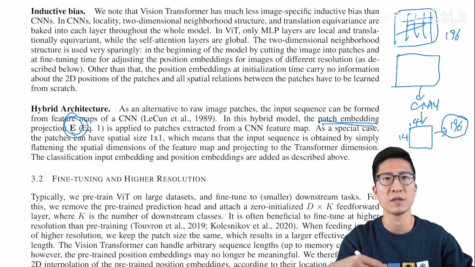 把图片划分成很多 patches,每个 patch 元素 是 16 * 16,序列长度 14 * 14 = 196个元素