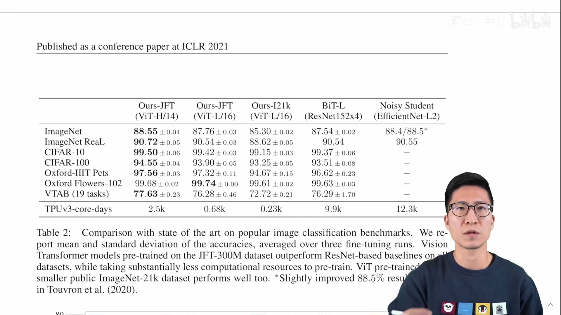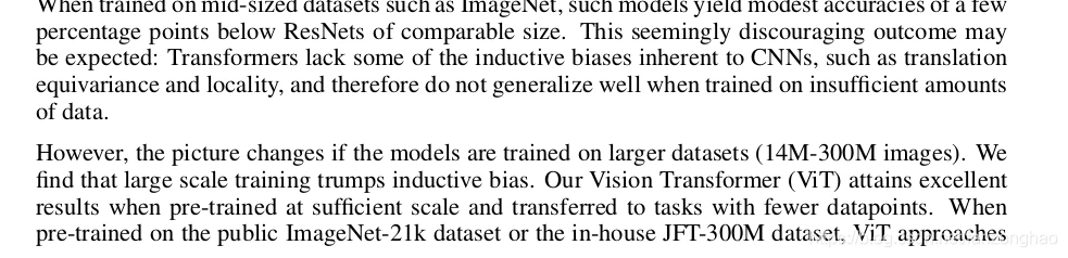 在 1400万(ImageNet-21K) - 3000 万(JFT-300)得到图片数据集上预训练 trumps inductive bias, ViT +足够训练数据,CV SOTA。