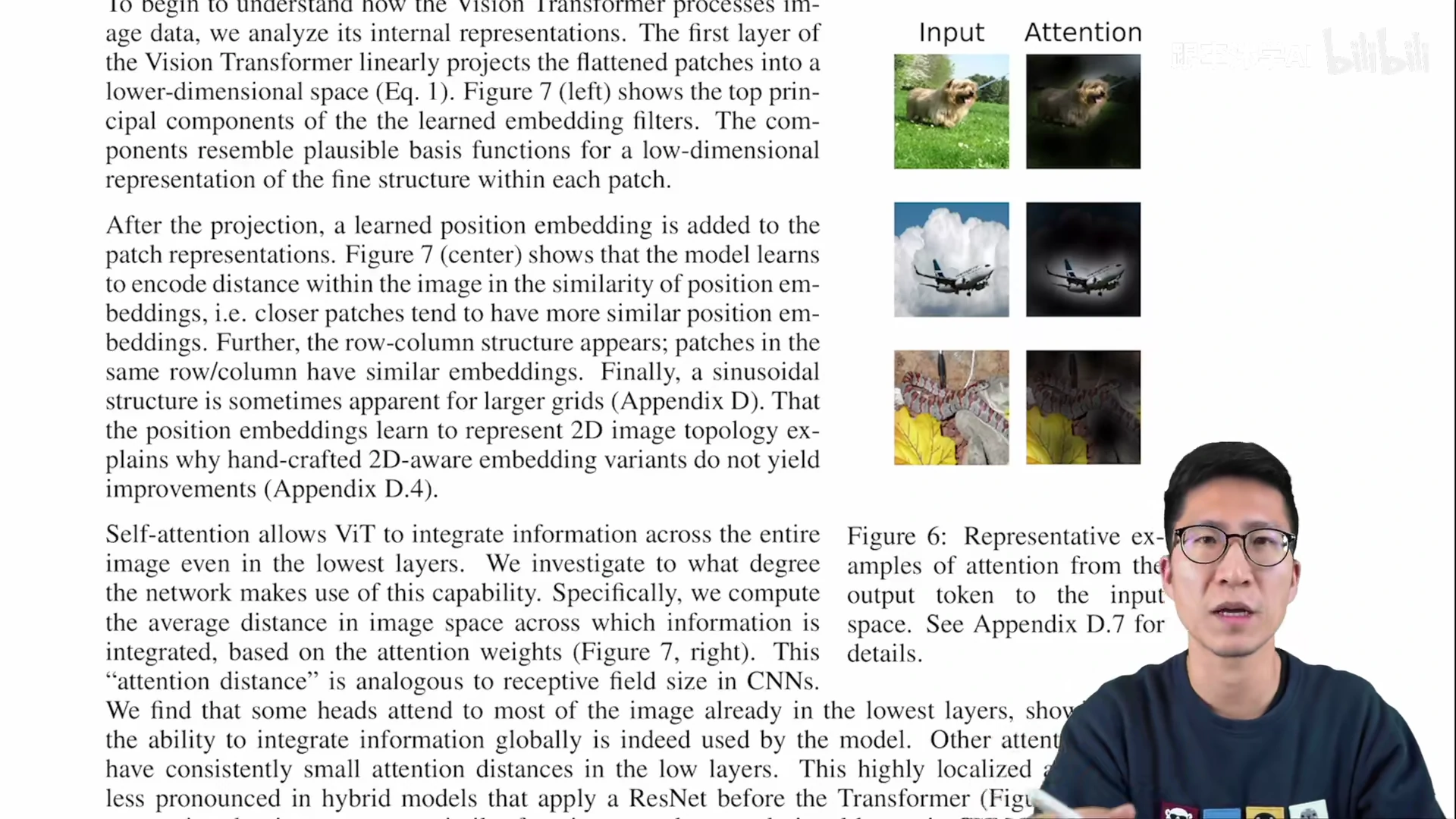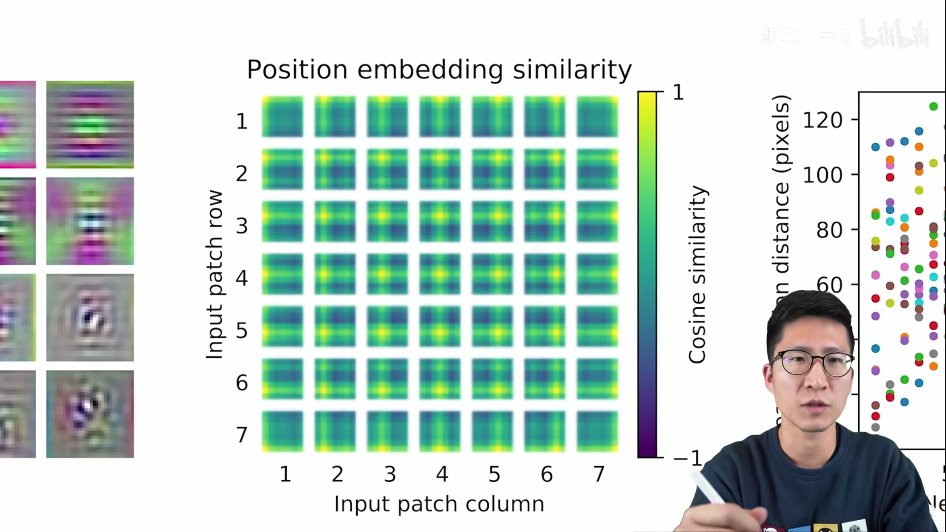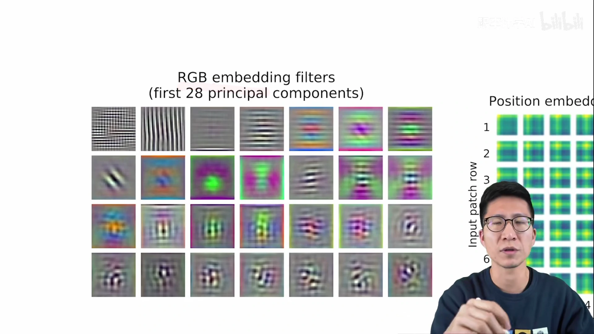 Vision Transformer 和 CNN 学到的很像,类似 gabor filter 有颜色、纹理, 可以做 plausible basis functions,可以描述每个图像块的底层信息 a low-dimensional representation of the fine structure within each patch.