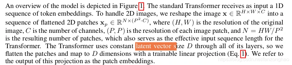 将图片 H * W * C,crop成N个patch,然后在转换成N * (p^2C),同时为了避免模型结构受到patch size的影响,采用Linear project将不同flatten patchs转换成D维向量。这样的话输入图片数据就成了N*D二维矩阵就和词向量矩阵对应上了。