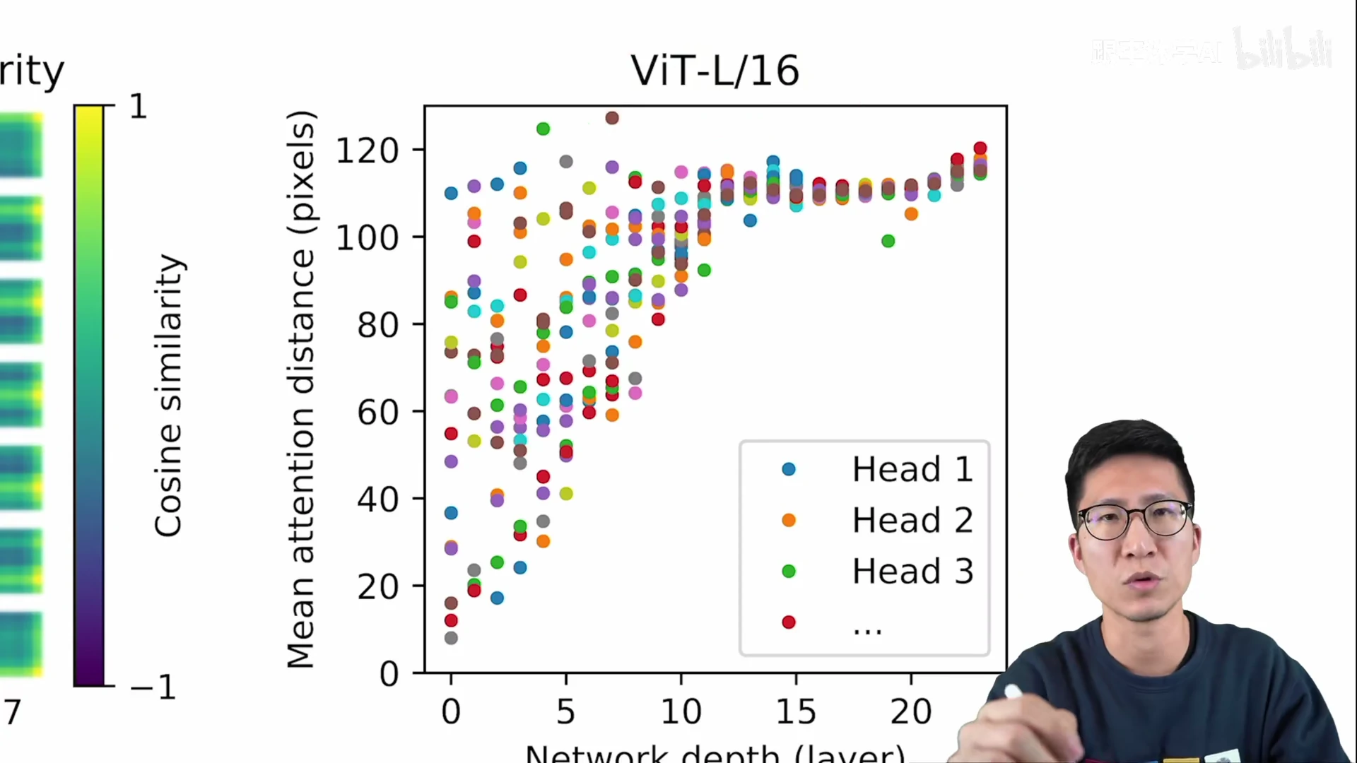 网络加深,模型学到的特征越来越 high level,越来越有语义信息,像素的自注意力距离 越来越远,不是靠邻近的像素点做判断。