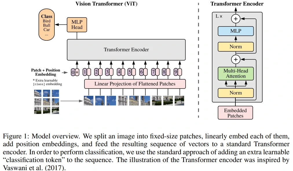 标准 Transformer 直接应用于图片,做最少的修改,不做任何针对视觉任务的特定的改变。