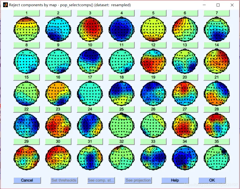 点击这里会画出所有ICA成分的缩略图,可以有一个全局观。在这里大致观察后如果觉得哪个成分有问题,可以点击查看大图