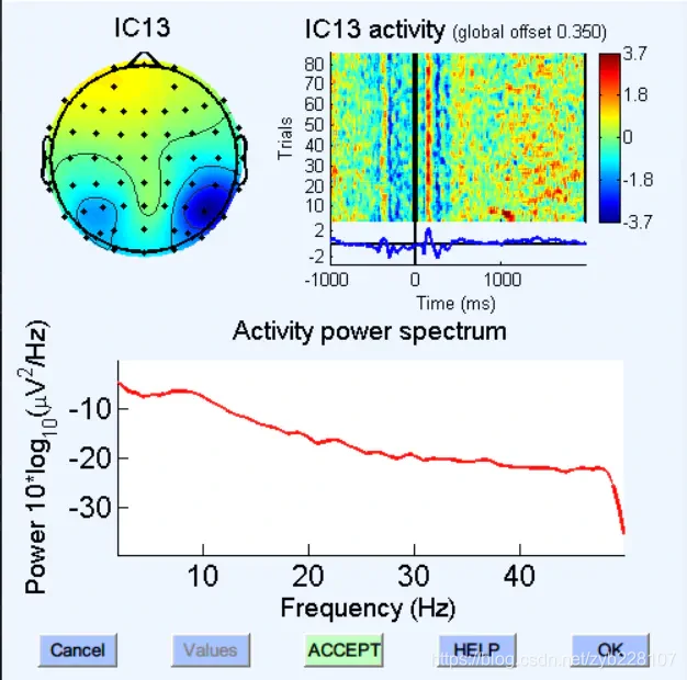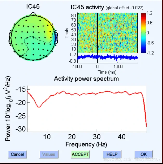 而这个能量集中在正前方,且低频能量高,成分排序成分最靠前,是一个很明显的眼动成分。