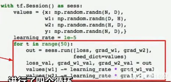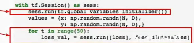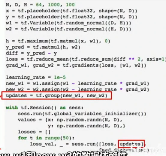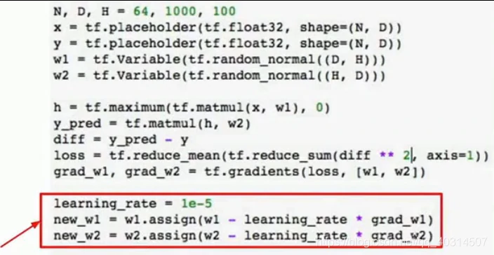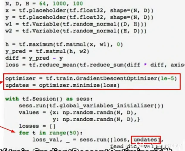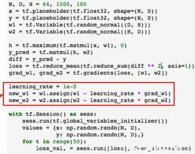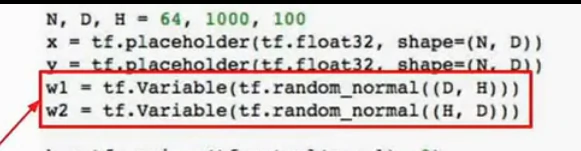 但是这里有个问题,我们每次用计算图进行前向传播时,我们实际上在对权重进行输入,我们将权重保存成numpy的形式,我们直接将它输入到计算图中,当计算图执行完毕,我们会得到这些梯度值,这些梯度值的个数与权重值的个数一致,这意味着我们每次运行图的时候,我们将从numpy数组中复制权重到tensorflow中才能得到梯度,然后从tf中复制梯度到numpy数组,我们如果只是在cpu中运行可能不是大问题,但是我们曾谈到CPU和GPU之间的传输瓶颈,要在CPU和GPU之间进行数据复制非常耗费资源,所以如果我们的网络非常大,权重值和梯度非常多,这样做就很耗费资源而且很慢,因为每个时钟周期都在CPU和GPU之间拷贝资源。tensorflow已经有了解决方案,这个想法就是将权重w1和w2定义为变量,而不是每次前向传播时都将它们作为需要输入网络的占位符,变量可以存在计算图中,并且当我们在不同时间运行相同计算图时,它都可以保存在计算图中,就是因为它们存在于计算图中,我们需要告诉tf,如何对它进行初始化。在上面的代码中,我们从计算图外部输入这些值,所以我们在numpy中对它进行初始化,但是现在它们存在于计算图中,因此tf复制初始化这些值,所以我们要执行tf.Variable(tf,random_normal((D,H))等操作,如下图: