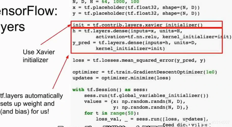 现在我们使用h=tf.layers.dense,(相当于定义了隐藏层),我们把X作为输入,单元数为H, 在这一行里,它设置了w1和b1(也就是偏差),它设置了形状正确的变量,并让这些变量存在于计算图中,但对于我们来说可以是隐藏的(这一整句话博主没听懂,如果有错误希望大家能帮忙指出来)。这段代码使用xavier.intializer()来为这些变量建立一个初始化策略,在之前的代码里,我们用tf.randomnormal来做这些事,但现在这种做法帮我们处理了一些细节,而且只是输出了一个h,我们可以看到,这个层里的激活函数是relue激活函数,所以这种方法可以定义很多细节。