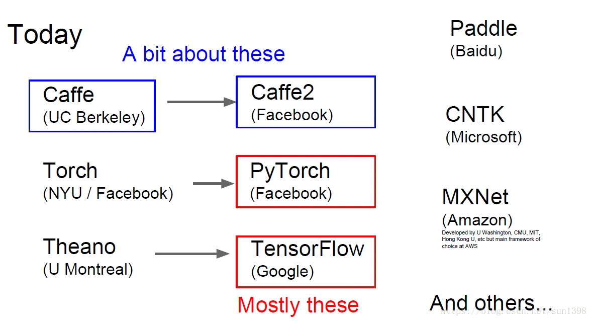 被主流使用的第一代深度学习框架大多是由学术界完成的,但是下一代深度学习框架全部由工业届产生。