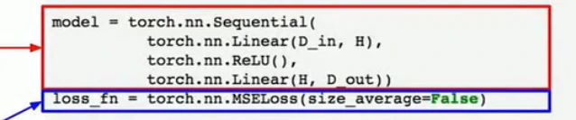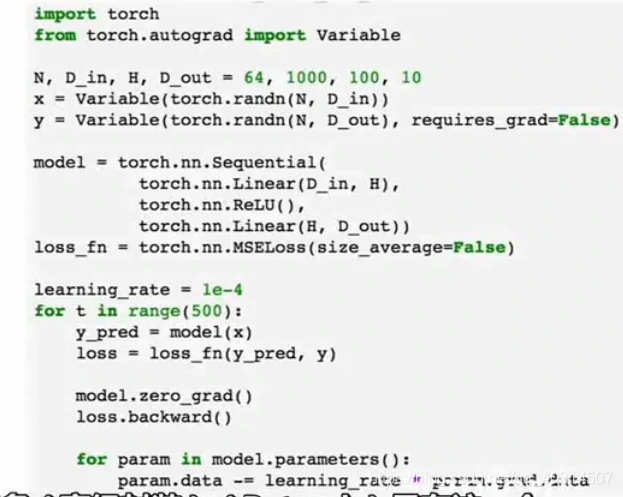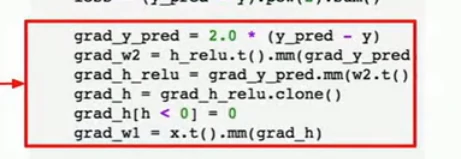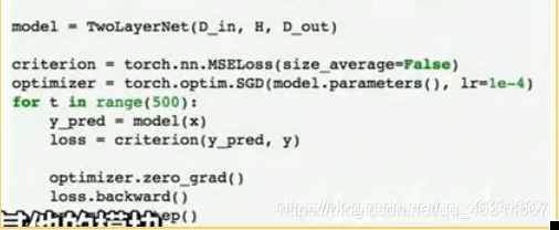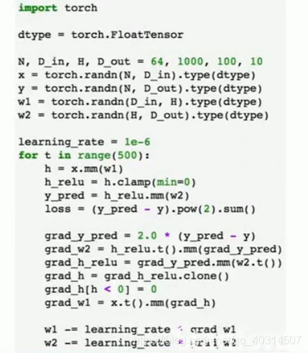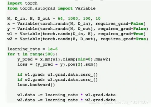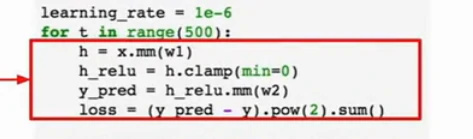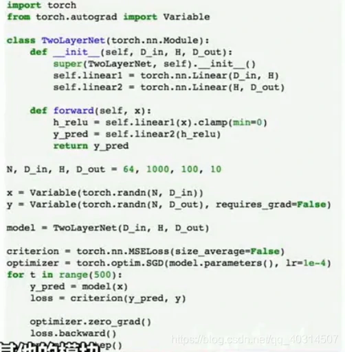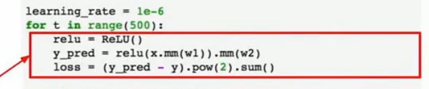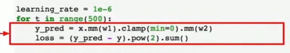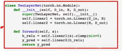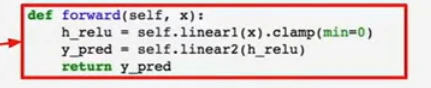 现在在前向传播时,我们可以使用自己的内部模块,也可以对变量使用任意的autograd操作来计算网络的输出,下面是forward操作的内容,输入作为一个变量,然后把输入的变量传给self.linear1作为第一层,用clamp函数去计算relu,再把输出传给第二层,然后就得到我们的输出y_pred: