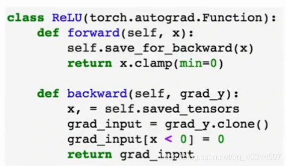 需要注意的是,tf和pytorch中有一点不同就是tf中,我们先构建显示的图,然后重复运行它,而在pytorch中,我们在每次做前向传播时,都要构建一个新的图,这使程序看上去更加简洁。还有就是在pytorch中,我们可以自己定义张量的前向和反向,来构造新的自动求解grad的函数: