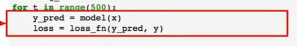 循环体中每一次迭代时,我们都可以在模型中前向传送数据得到预测值,把预测值放入损失函数,得到损失值: