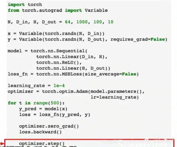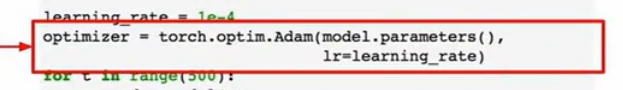 Pytorch也提供了优化操作,将参数更新的流程抽象出来,并执行Adam之类的更新法则,这里我们建立了一个optimizer对象,告诉它我们想要对模型中的参数进行优化,并且可以设置学习率等超参数: