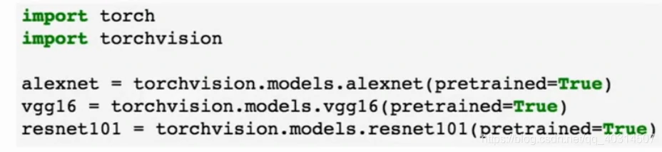 pytorch提供了一些预先训练好的模型,如下图,只要让torchvision.model.alexnet(pretrained=True)