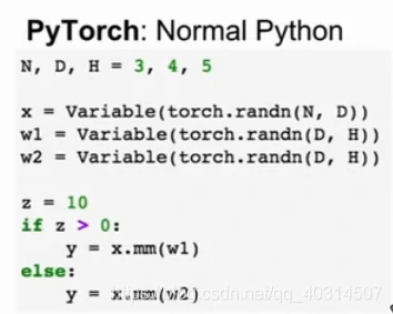 在pytorch中我们用的是动态图,所以非常简单,我们可以只用正常的python控制流来操控这个事,因为我们每次都要建图,每次都会执行这个操作,在每次前向传播中可以选择不同的条件来建立不同的图,当我们结束建立,我们还可以反向传播