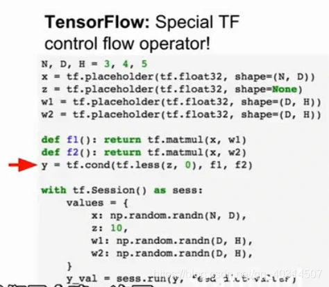 在tensorflow中就比较复杂了,因为我们只建一次图,这样的控制流操作就需要在tf图中一个明确地操作,所以有tf.cond在tf中,就像是if语句,但它被放到计算图中而不是python那样的控制流中,问题就是我们只会建一次图,所有的可能的控制流路径我们都需要提前建立好,在我们运行前放到图的函数中,这就意味着控制流的操作比较特殊,与python控制流操作不同