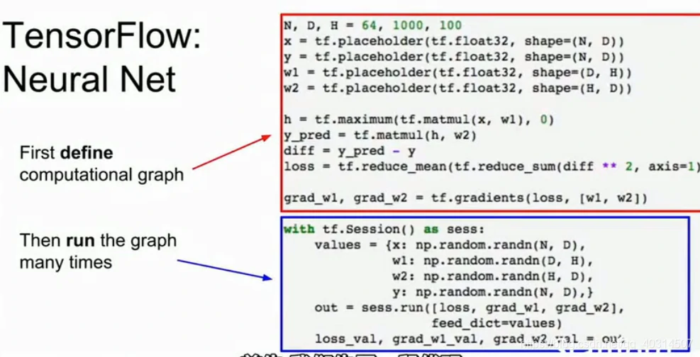 这时候我们已经完成了计算图的构建,内存中已经存储了计算图数据结构的数据,现在我们进入一个tensorflow的会话,来实际运行计算图并且输入数据。一旦我们进入会话,就需要建立具体的数据,来输入给计算图。所以大多数时候,tf只是从Numpy数组接受数据,这里我们只是用Numpy为X Y和w1 w2创建具体的数值,并在字典中进行存储。这时候我们才是真正在运行计算图,可以看到我们调用了session.run来执行部分计算图的运算,并且计算需要的值然后向numpy数组再次返回具体的数值。至此我们只是在计算图上完成了正向和反向传播,如果想训练网络,我们只需添加几行代码。