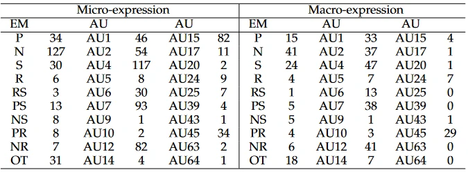 表中是MEs的情绪和AU统计(各模态)。P、N、S、R和OT分别代表正、负、惊讶、压抑和其他。他们代表了情感。