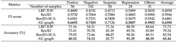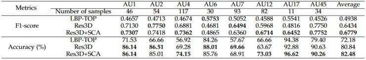 在AU检测中三种测试方法的准确率和f1值都是Res3D+SCA > Res3D > LBP-TOP。使用Res3D+SCA得到的最佳平均准确率为82.48%,最佳平均f1值为0.6779。研究结果与先前的研究结果一致。