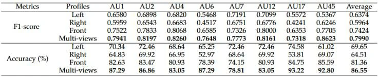 在使用三视图即多视图协同识别AUs时,取得了0.7990的平均F1-score和86.55%的平均准确率,明显高于三个单视图中的任何一个。实验结果与我们的预期相吻合,当显示更多的面部区域(无遮挡)时,即多视角>额部>左、右部>时,AU检测性能会更好。4D数据承载更多信息,提高系统性能。